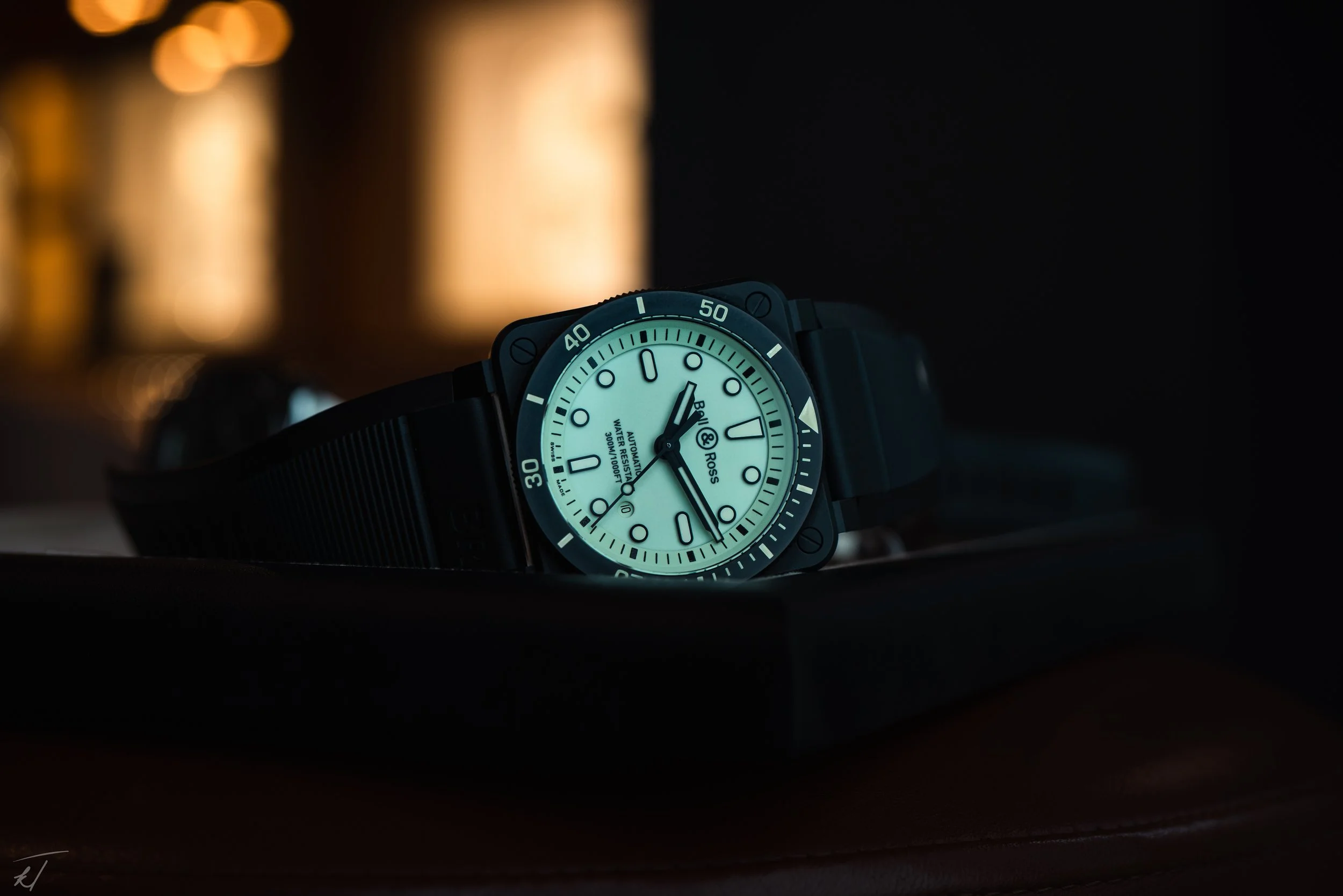 Sylvain: Yes! This is a limited edition run of 999 watches: A BR-03 diver. This is the last one left in Norway. It is a true full lume, from the dial, indices to the hands. A unique piece, also with a ceramic case. It features Super-luminova C5, so it turns really green in the dark. It is a true diver with 300m water resistance.